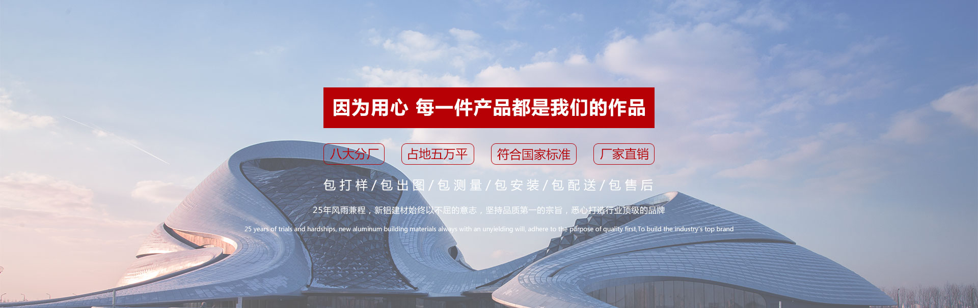 廣東新鋁裝飾材料有限公司是一家專業生產室內外金屬鋁單板、鋁天花板、鋁蜂窩板、鋁窗花、弧形鋁方通、仿大理石板、仿木紋板、瓦楞板及鋁型材加工噴涂的現代化企業,有著10多年研發、生產、銷售、安裝一條龍服務的集團公司。公司擁有先進的數控鈑金加工設備,配備了日本蘭氏全自動靜電氟碳涂線、數控沖床、數控剪板機、數控折彎機及全自動真空吸塑熱轉印機、數控熱壓機等多套先進的高精度的幕墻產品生產加工設備。廣東新鋁裝飾材料有限公司秉承“以人為本、科技為先”的經驗理念,堅持規模化運作,規范化經營的發展思路,建立了完善的營銷網絡及高素質的銷售隊伍,擁有一支豐富經驗的設計團隊,專門配合建筑裝飾材料的深化設計及工藝構思,品牌精益求精理念,高品位的產品、良好的質量、精湛的工藝,豐富齊全的產品、安全可靠的質量和專業完善的服務系統享譽于行業!